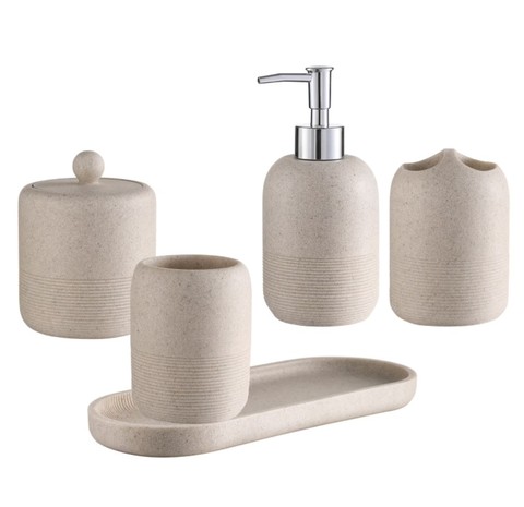 อุปกรณ์ห้องน้ำ Polyresin ชุดอุปกรณ์เสริม5ชิ้นชุดที่มีคุณภาพสูง-เครื่องจ่ายโลชั่น/ที่ใส่แปรงสีฟัน/ขวดฝ้าย/ถาด