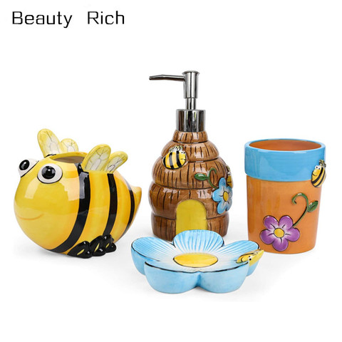 4 ชิ้น 3D ผึ้งและดอกไม้อุปกรณ์ห้องน้ำ Ensemble ชุดผู้ถือแปรงสีฟัน,แปรงสีฟัน,สบู่,จานสบู่